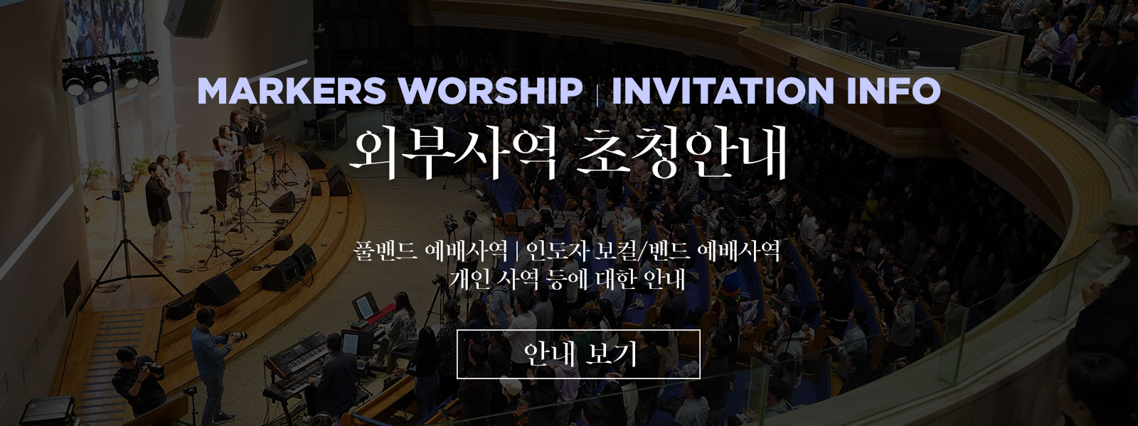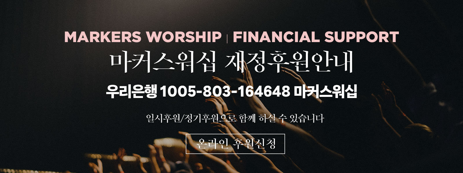 마커스워십은, 연합으로 마커스 목요예배를 함께 진행하고 있습니다. 마커스워십과 둘로스선교회(대표 김남국 목사)가 연합으로 계속해서 함께 하고 있으며, 예배 코퍼레이터(아티스트/안내/진행)와 얼라이브 컴퍼니(영상)의 섬김으로 함께 예배를 세워가고 있습니다.